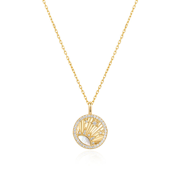 Sterling Silver 14K Gold-Plated Ania Haie's Sunshine Chaser Cubic Zirconia And Mother-Of-Pearl Sunrise Pendant. The Chain Style Is Cable Link With A Length Of 17.5 Inches With Two 1 Inch Extensions To Bring It To 19.5 Inches.