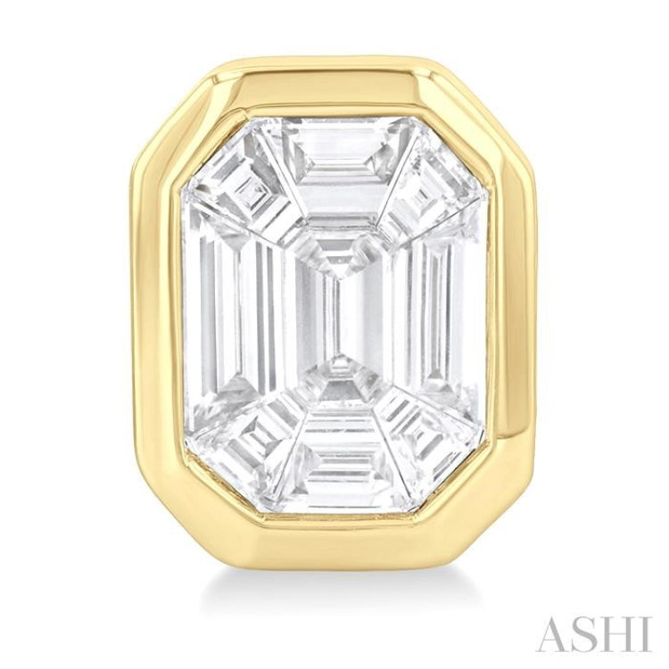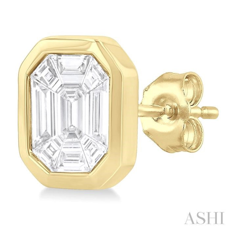 These stunning diamond fashion stud earrings showcase the elegance of an emerald-shaped pie cut diamond, meticulously set in an invisible setting that highlights the diamond's brilliance. Each stud earring features a single emerald-shaped diamond, offering a sleek and sophisticated look. The earrings are secured with push-back earnut closures for a comfortable and secure fit. Styled in 14 karat yellow gold, these earrings bring a touch of modern luxury to any ensemble. The total diamond weight is 3/8 Ctw.
