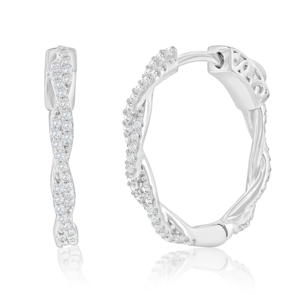 Sterling Silver Earrings. Sterling Silver Rhodium-Plated Twisted Hinged Hoops Bedazzled With Cubic Zirconia.