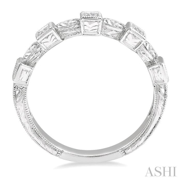A well-structured and designed ladies Band, this makes for a fine choice. It is embellished with marquise and princess cut diamonds that lend attraction to the Band. 5 square mounts holding a princess cut diamond each, are linked together with 4 marquise cut diamonds, held in mounts joining the square mounts. The princess cut diamonds is further enhanced with a milgrain lattice outlining the rims of the mounts. Styled in 14 karat white gold, the Band offers panache to any outfit. Total diamond weight is 3/8 Ctw.
