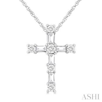 Diamond Pendant In Gold. 10K White Gold Rhodium-Plated Round And Baguette Diamond Cross Pendant On 10K White Gold Rhodium-Plated 18 Inch 0.40 mm Loose Rope Chain With Spring Ring Clasp. 0.06 Total Diamond Weight With K/L Color And I1-I2 Clarity.