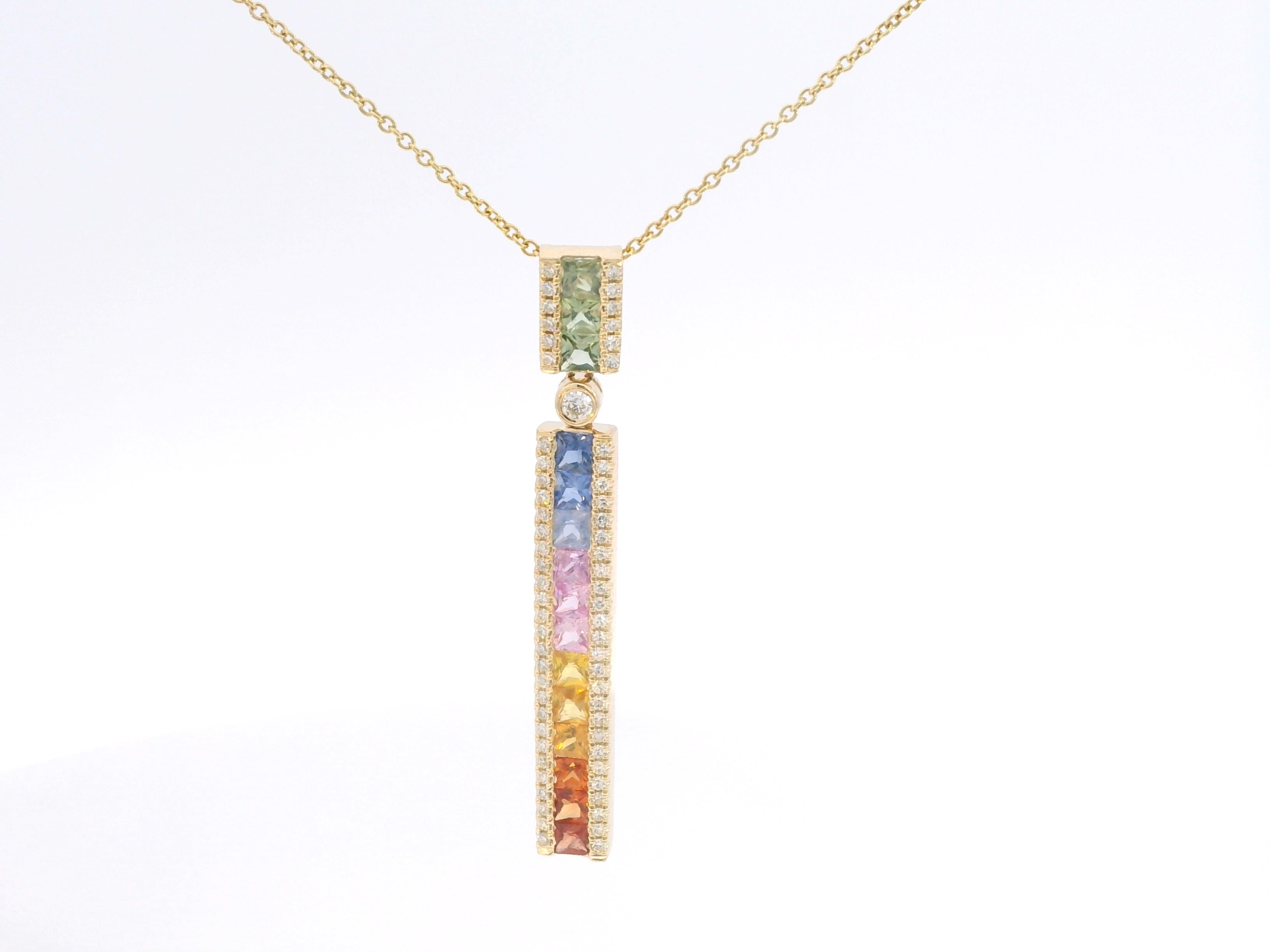 Gemstone Pendant. 14k Round Diamond Rainbow Pendant. I Color mm x . 0.04 color clarity Square Cushion Side Sapphires. 1.66 total diamond weight. 18 inches.