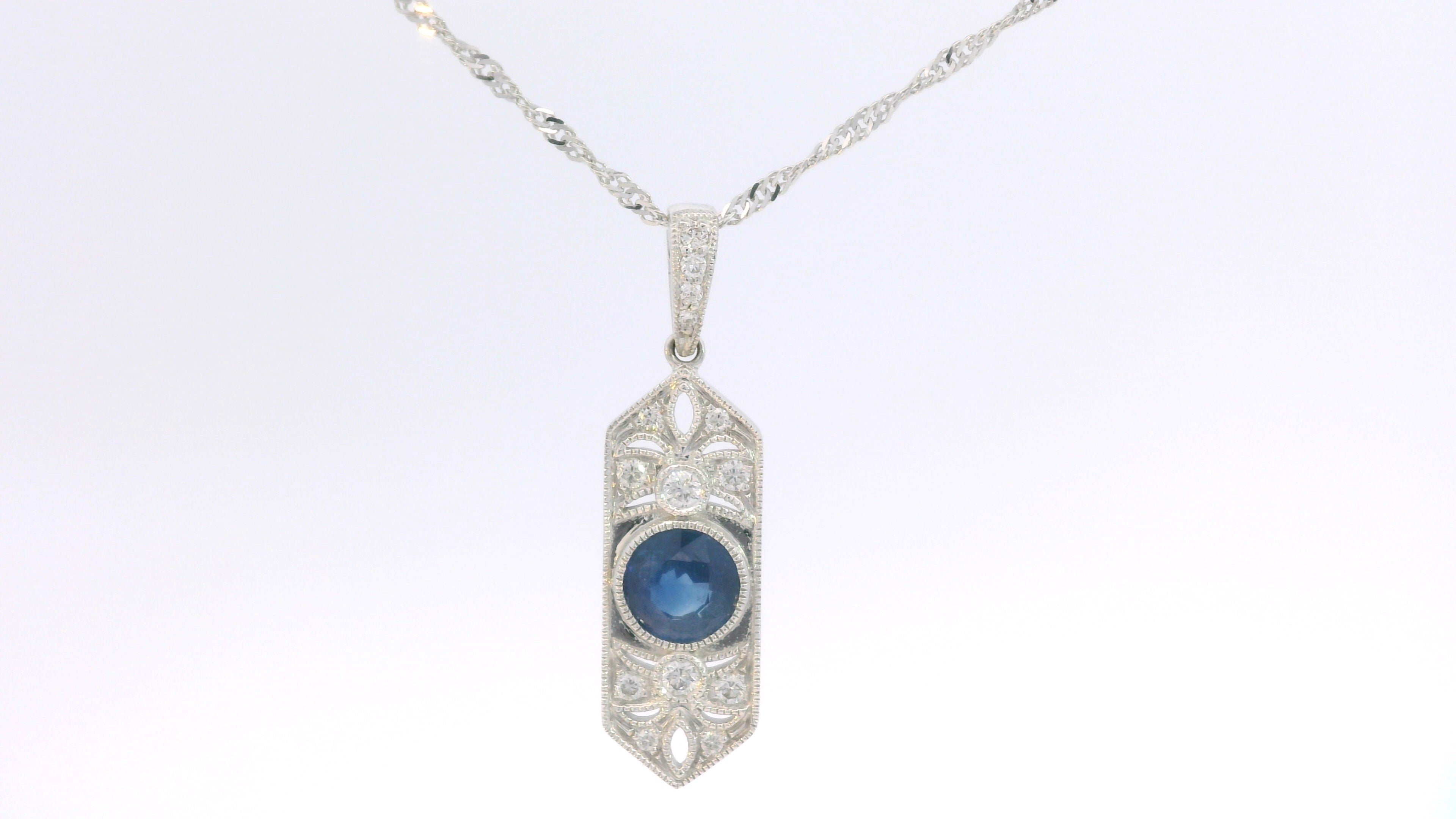 Gemstone Pendant. 14K White Gold Round Diamond Art Deco Pendant On A 14K White Gold 18 Inch Singapore Chain. The Total Diamond Weight Is 0.16 Carats.