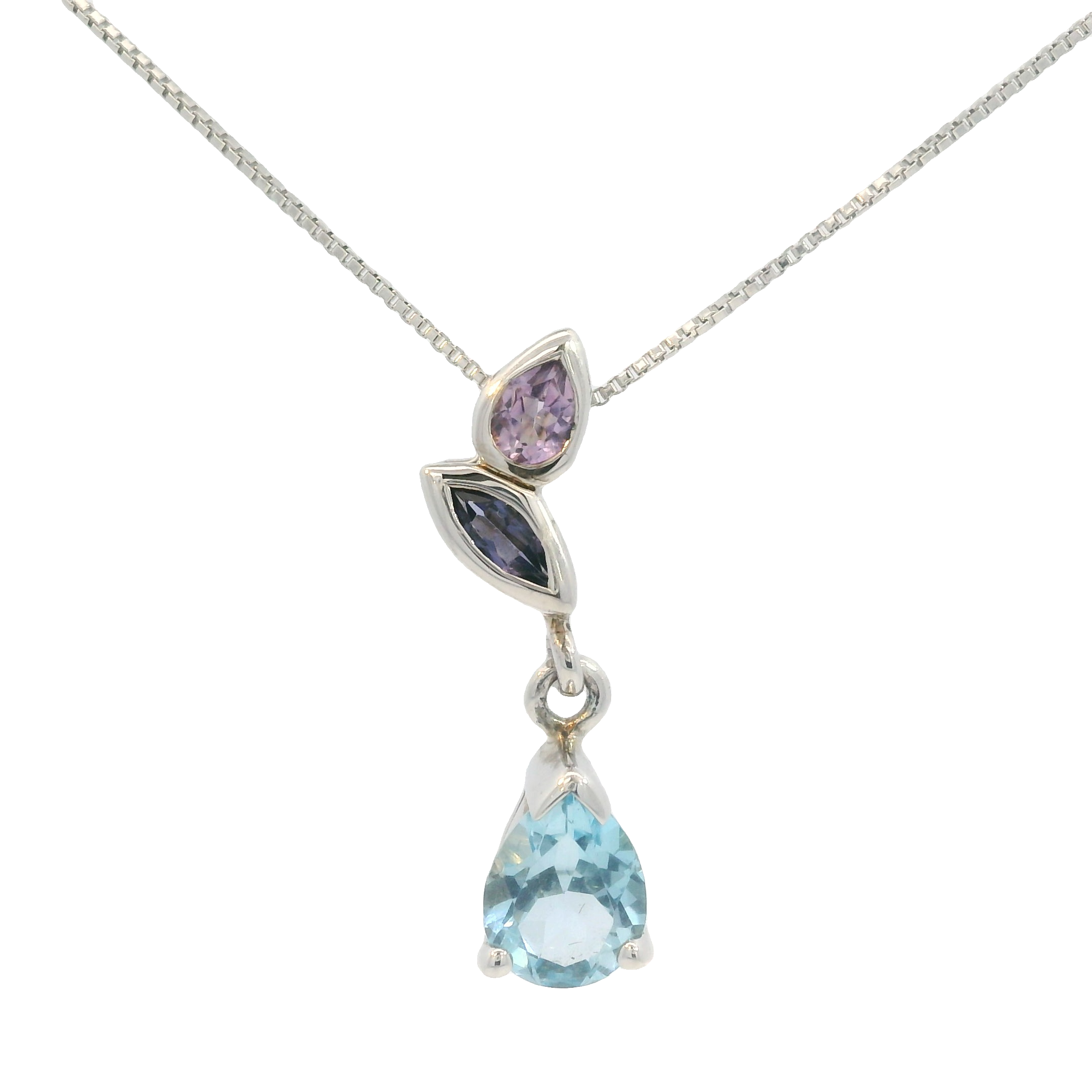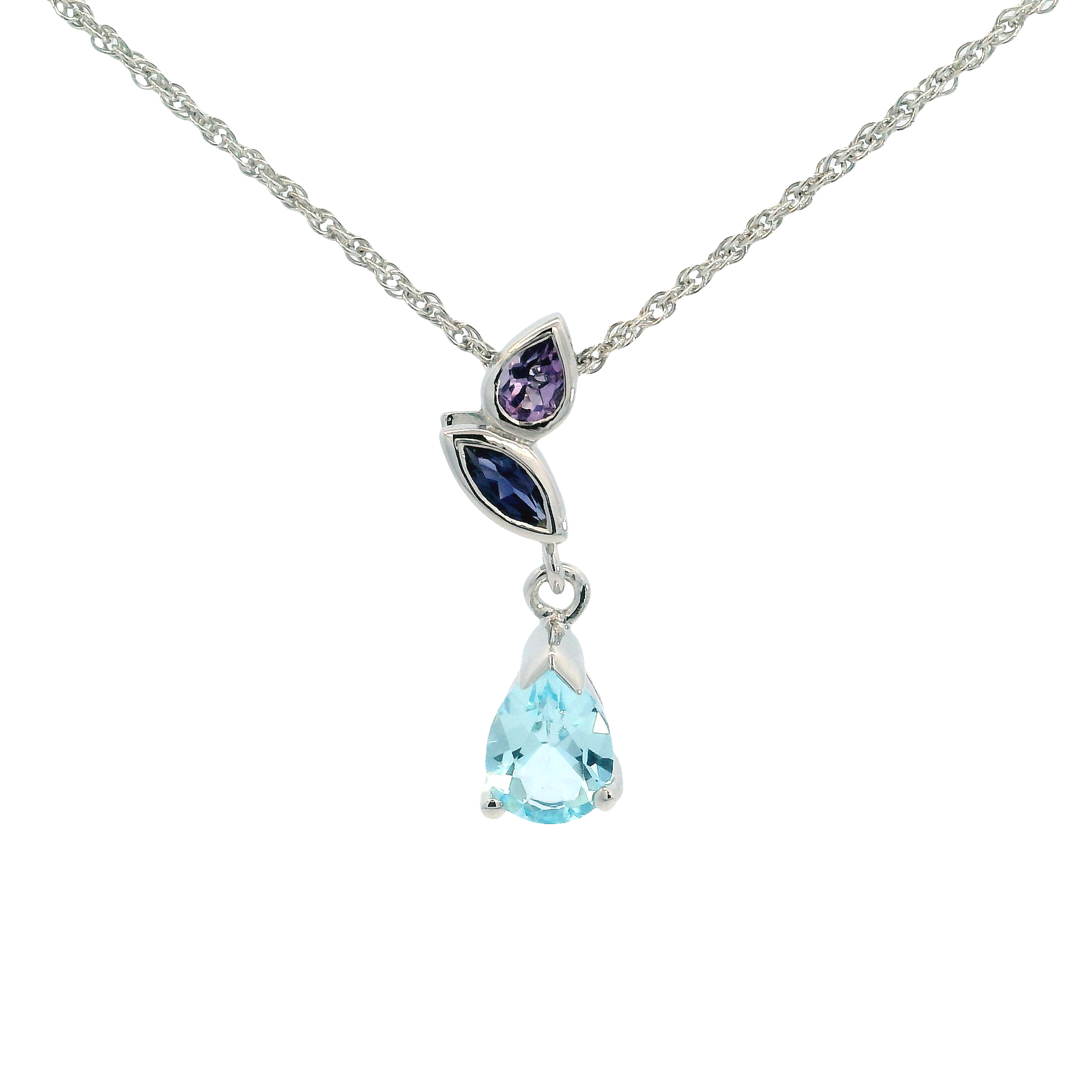 Gemstone Pendant. Sterling Silver Blue Topaz. Iolite, And Rhodalite Pendant On Sterling Silver Rhodium-Plated 20 Inch Loose Rope Chain With Extensions. 1.55 Carat Blue Topaz.