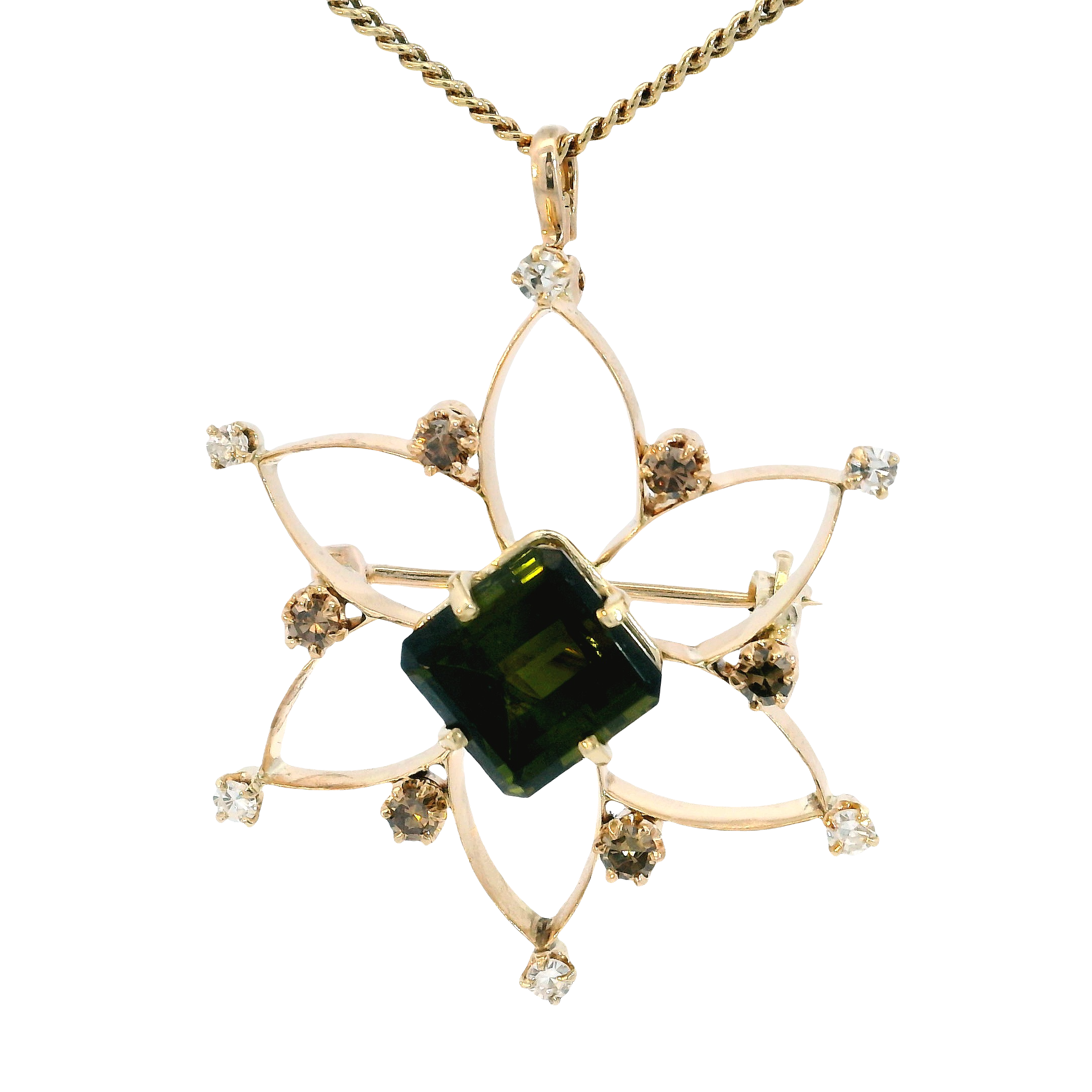 18Kt Yellow Gold Floral Design Antique Pendant/Pin With 4 Carat Genuine Asscher Cut Green Tourmaline Accented By 6 Genuine Champagne & 6 White Diamonds. .45 Carat TDW. All jewelry pieces in the Estate Jewelry collection are previously owned and sold as is. Due to their age and prior use, these items may exhibit some signs of wear or imperfections consistent with their age and history. The condition of each item and its contents (Gem Type, Carat Weights, and Qualities) are described & listed to the best of our ability as the item permits during evaluation.