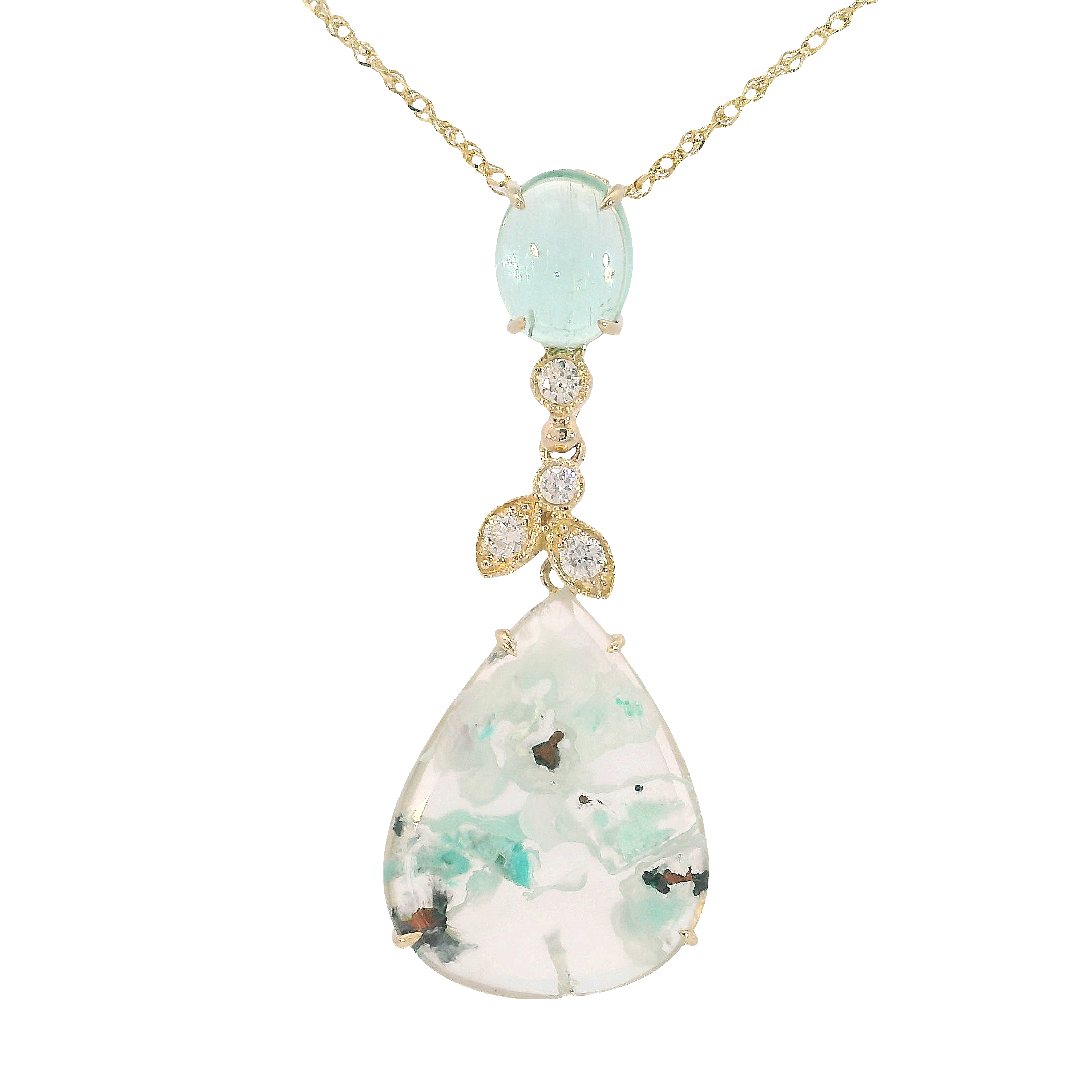 Gemstone Pendant. 14K Yellow Gold Aquaprase And Mint Tourmaline Pendant. 4.00 Carat Aquaprase. 1.16 Carat Mint Green Tourmaline. 0.12 Total Diamond Weight. 18 Inches.