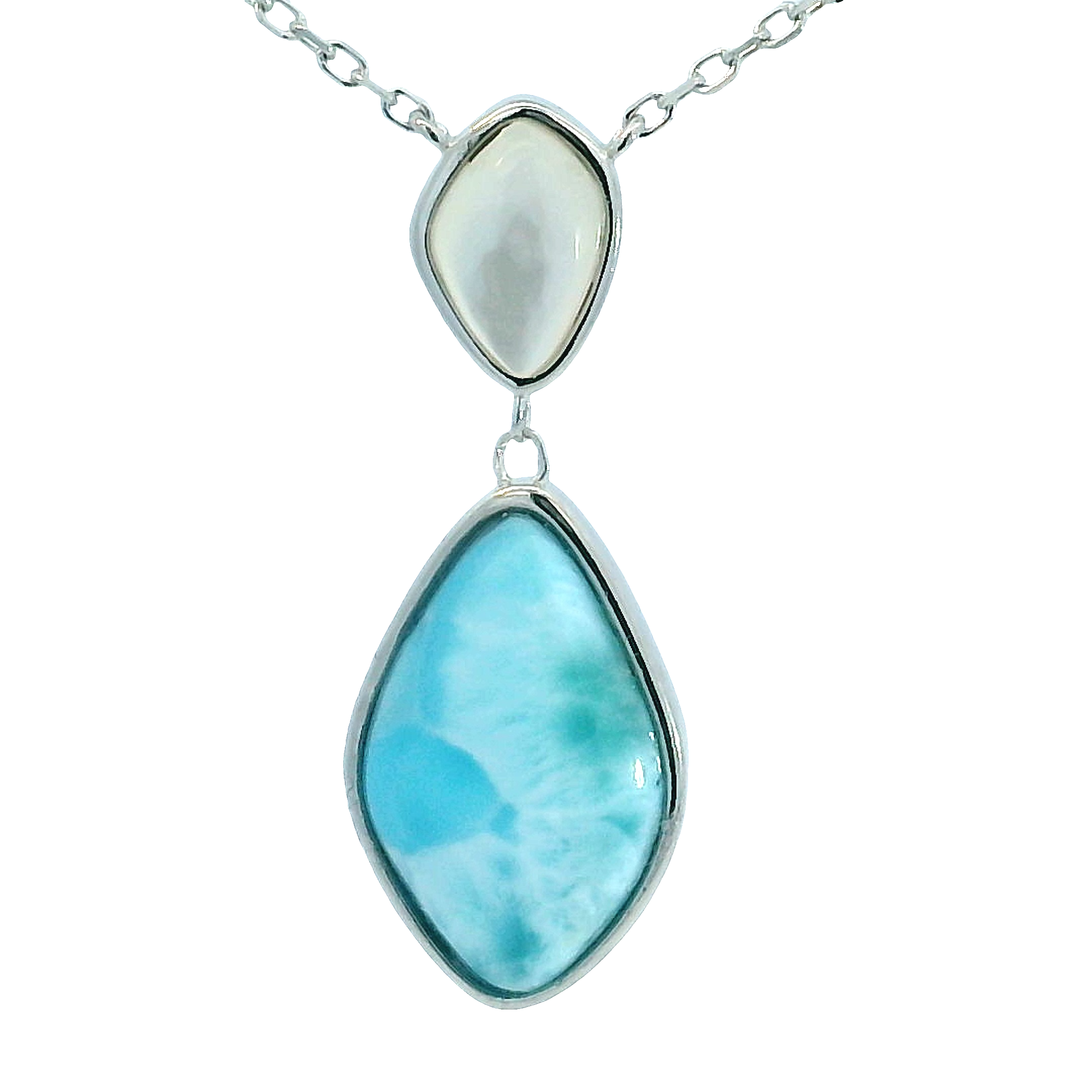 Sterling Silver Gemstone Necklace. Sterling Silver Rhodium-Plated Larimar And Mother-Of-Pearl Pendant On 18 Inch Sterling Silver Rhodium-Plated Cable Link Chain With Two Inches Of Extensions And Fancy Lobster Clasp.