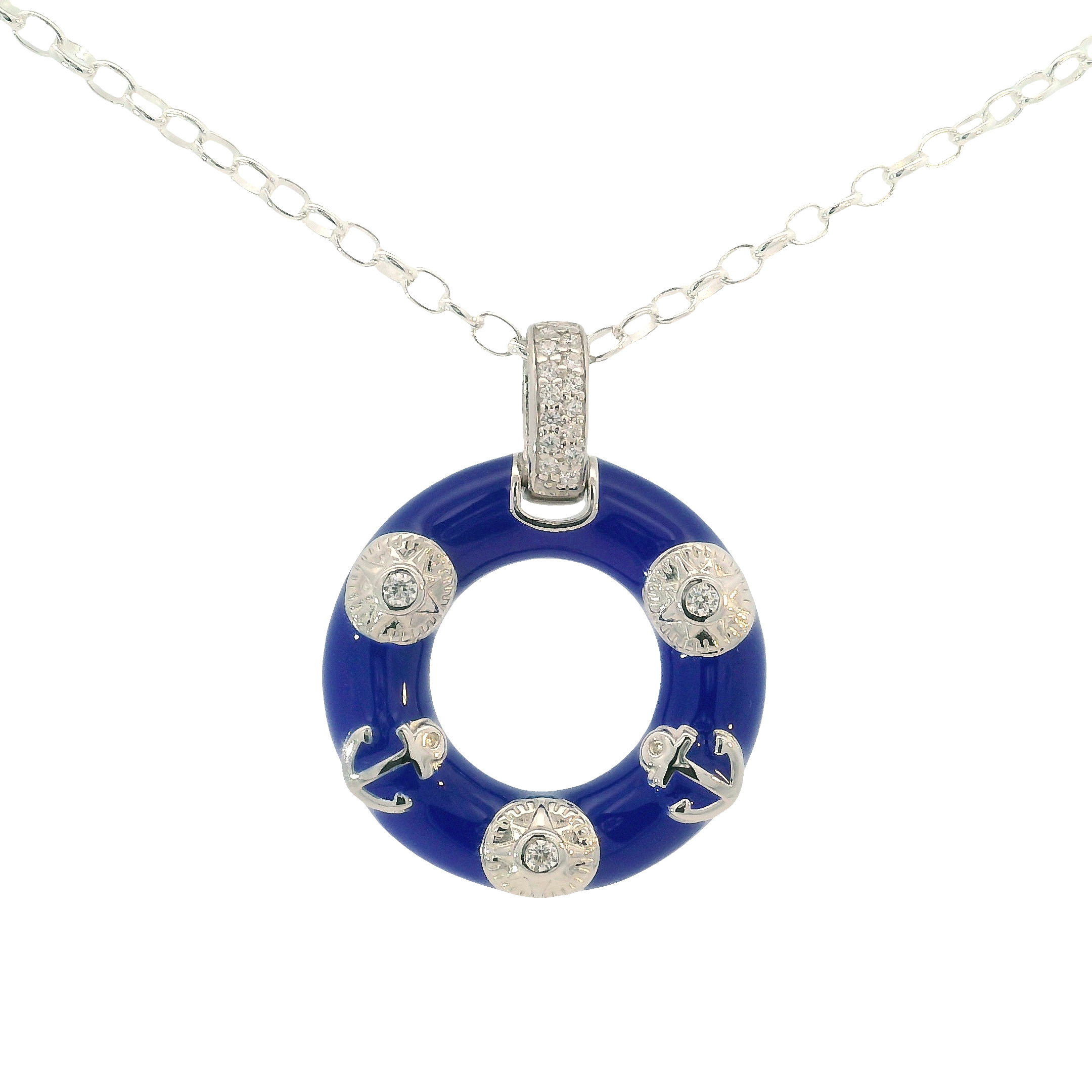 Sterling Silver Pendant. Sterling Silver Rhodium-Plated Hand Painted Enamel Maritime Pendant With Cubic Zirconia Accent Stones On Sterling Silver 1.6mm 20 Inch Fancy Rolo Chain With Two Inches Of Abridgements.