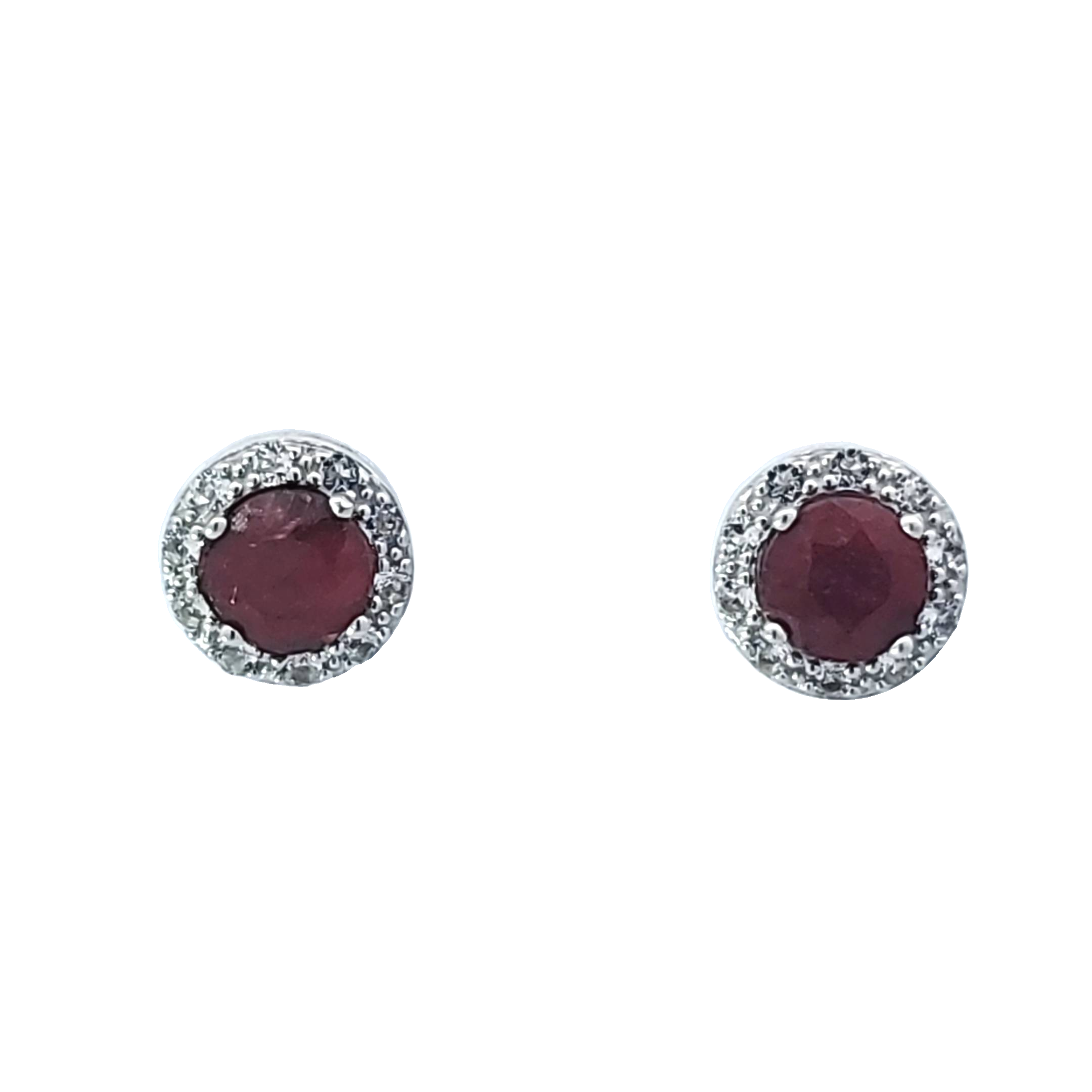 Sterling Silver Earrings. Sterling Silver Rhodium-Plated 5mm Dyed Red Sapphire And White Topaz Halo Post Back Earrings.