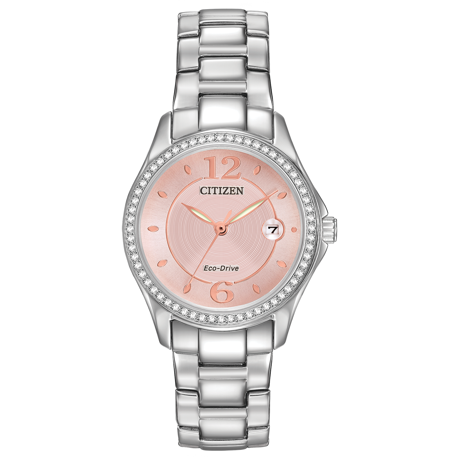 Citizen "Silhouette Crystal" - Shining Bright With Crystals And Featured In A Stainless Steel Case And Bracelet With Blush Pink Dial. Includes Date Feature. Featuring Our Eco-Drive Technology – Powered By Light, Any Light. Never Needs A Battery. Caliber Number J710.