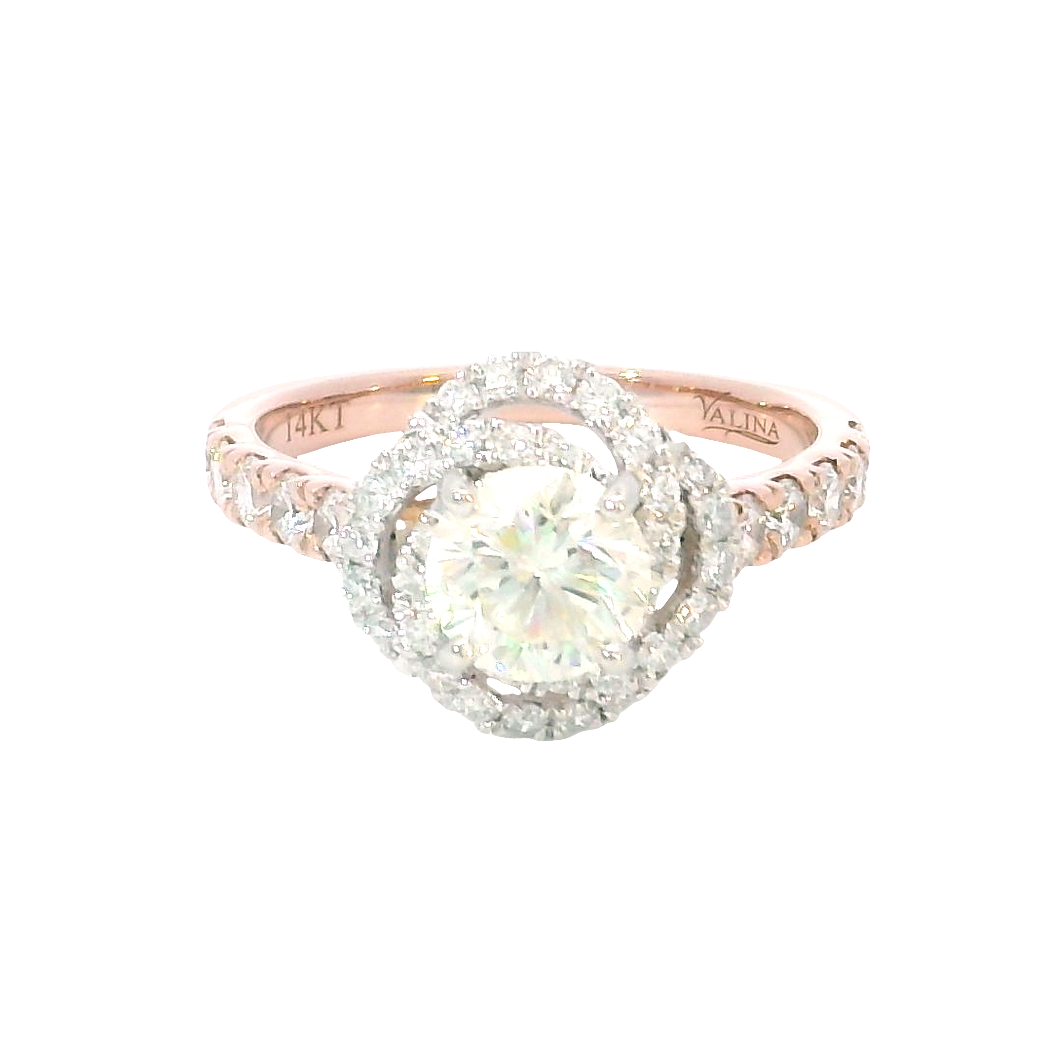 14k Two Tone Rose and White Gold Floral Halo Diamond Engagement Ring with 1.02ct Round Fire Polished Center Diamond