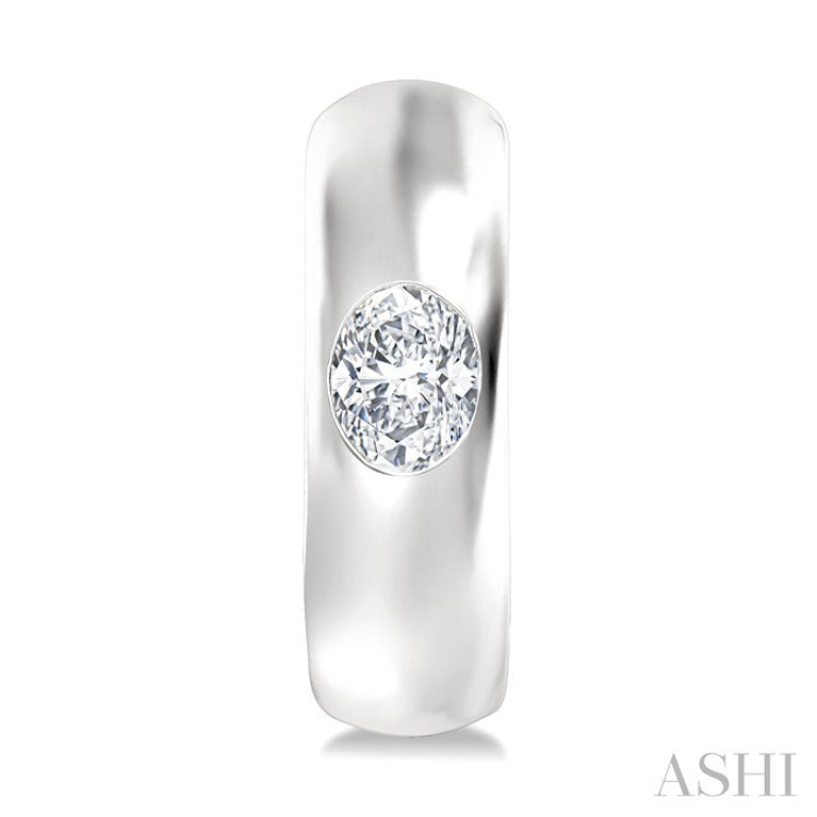 Exuding refined elegance and subtle sparkle, these diamond fashion huggies redefine modern sophistication. With a simple, plain gold body serving as a graceful canvas, each huggie earring highlights a bezel set 1/6 Ctw oval cut diamond center stone on the hoop front. Crafted in a lustrous polished rhodium finish 14 karat white gold, these diamond fashion huggie earrings offer a delicate yet striking statement of timeless style. Total diamond weight is 1/3 Ctw.